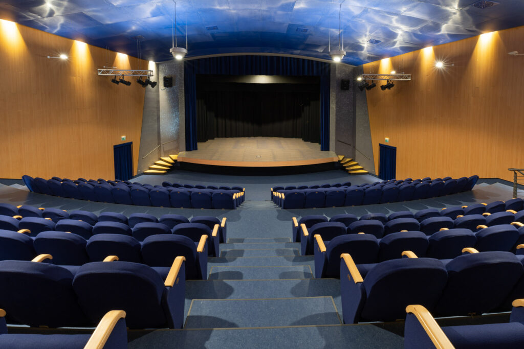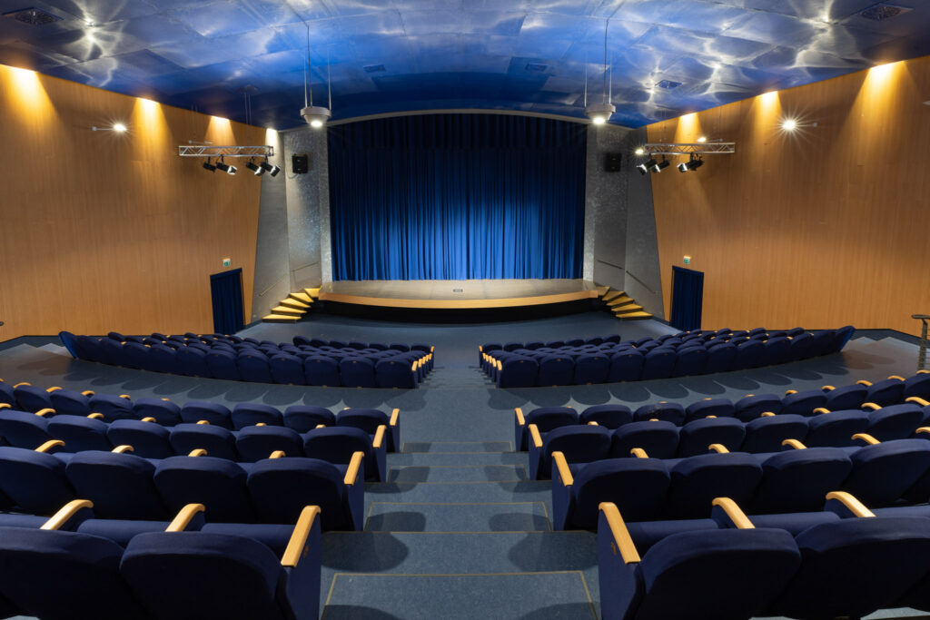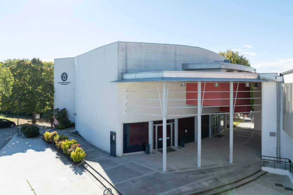 Inaugurato nel 2013, l’Auditorium comunale si apre con uno spazio delimitato da pilastri circolari e vetrate che conduce all’entrata tramite due ampie aperture che portano al guardaroba ed alle scale d’ingresso alla sala. Questa presenta in pianta una forma a ventaglio ed è divisa in quattro settori per un totale di 228 posti, oltre altri due per persone diversamente abili, separati da passaggi trasversali e longitudinali in corrispondenza delle scalinate.